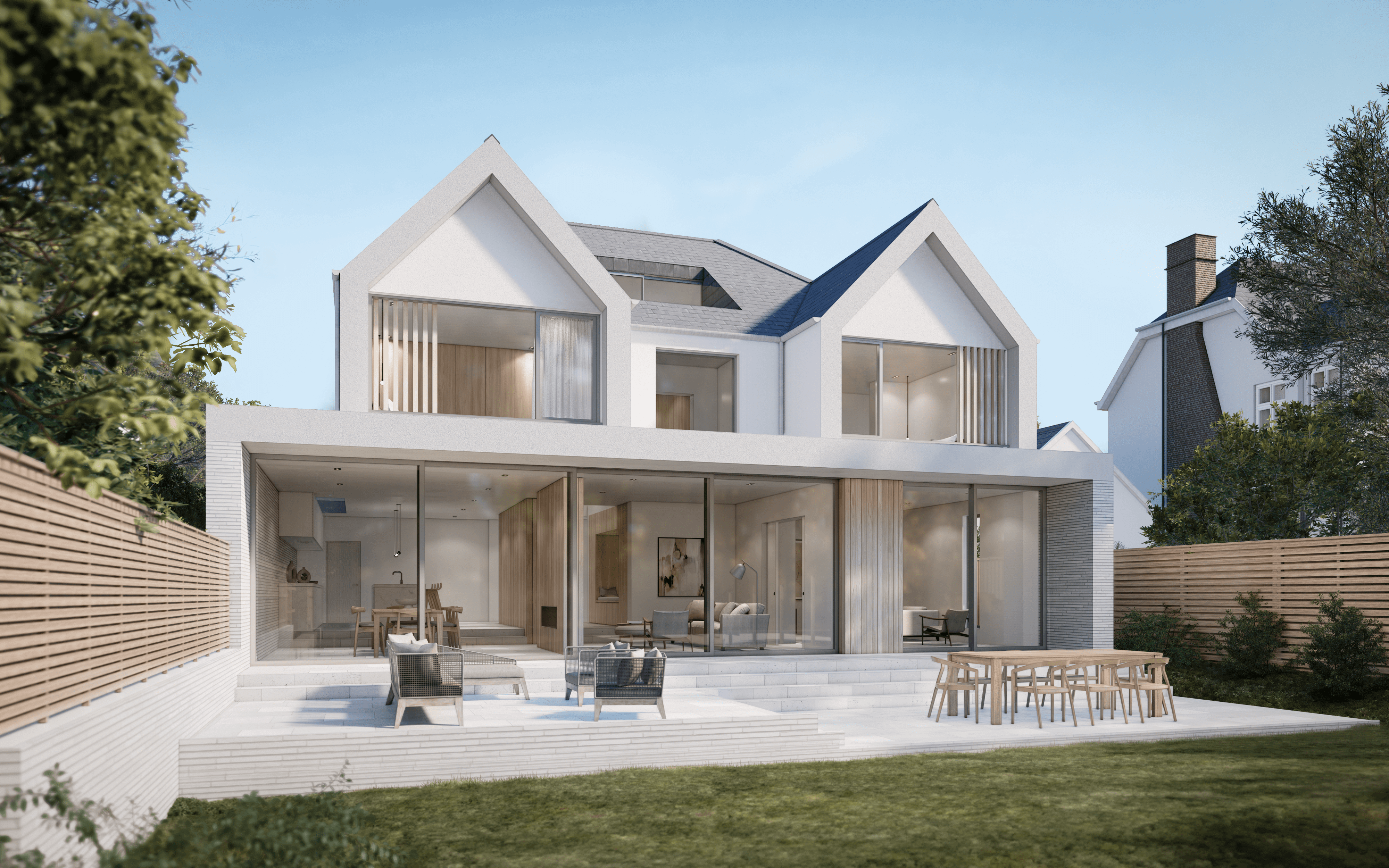 The rear is characterised by two flanking gables which create an element of symmetry. The single storey ground floor linear volume overhangs to the south to prevent the mostly glazed façade from overheating. Focusing on simplicity aims not to create a busy or over complicated appearance, but a rationalised one which avoids necessary detail. The linear/horizontal brick continues from inside to out, pulling the outside in and vice versa.