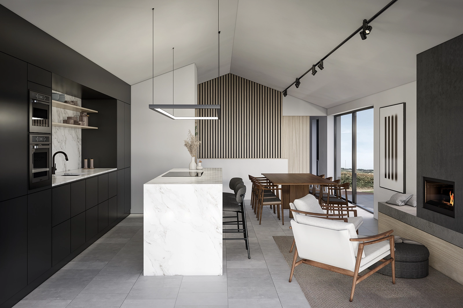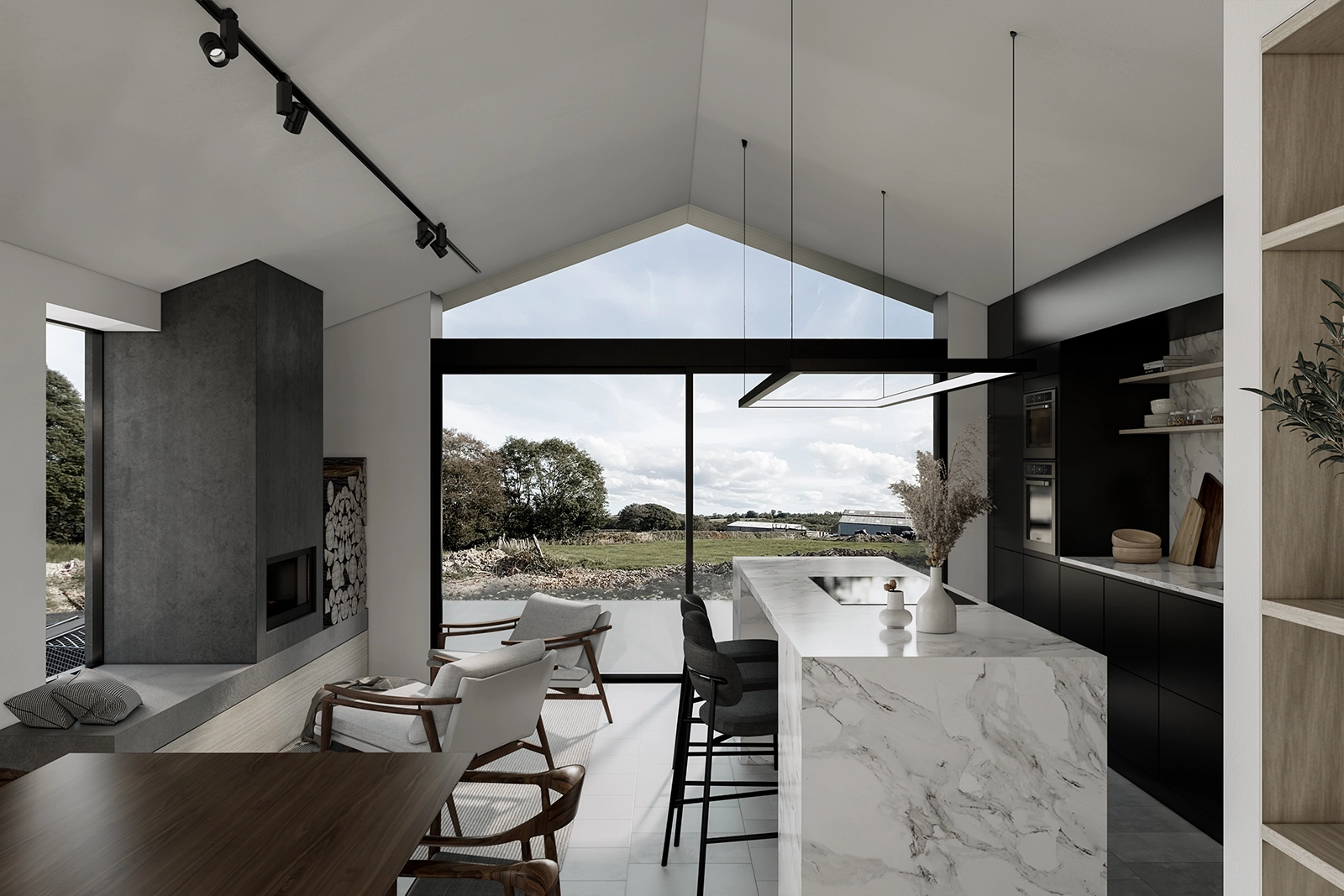 KŌST didn’t want to lose the charm of the existing barn and so replicated the form but enhanced elements such as the addition of the chimney and gable projections as well as developing the textures of the proposed facades.